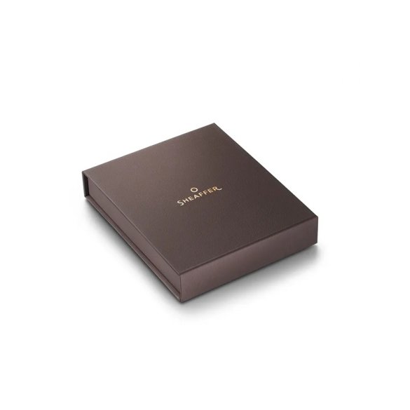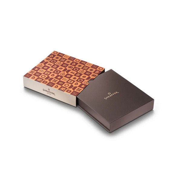 Zestawy Sheaffer Coffee Edition są elegancko zapakowane w ciemnobrązowe, teksturowane pudełko z brązowym, metalicznym logo.